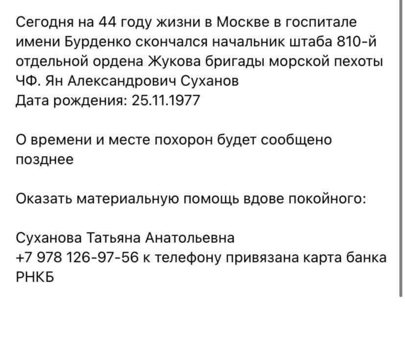 "В московській лікарні помер начальник штабу 810 бригади морської піхоти ЧФ РФ Ян Суханов, який був важко поранений під час української атаки у травні", - написав він, додавши деякі повідомлення російських пабліків.