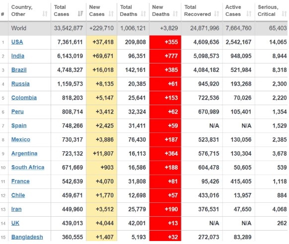 Всього ж в світі коронавірус підтвердили у понад 33,5 млн осіб.