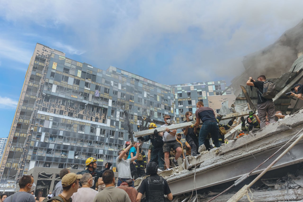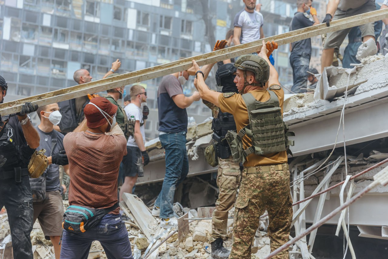 У поліції зазначили, що аварійно-рятувальні роботи тривають. Також оприлюднили кадри з місця розбору завалів у Києві.