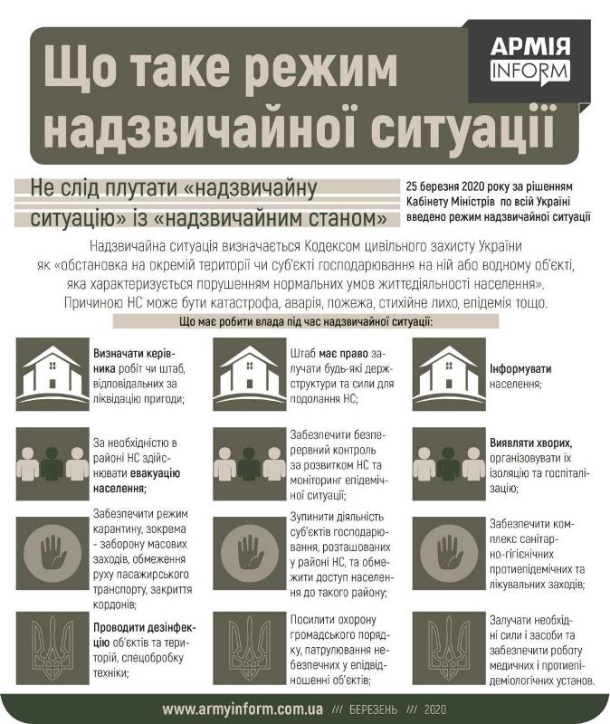 Уточнюється, що в режимі НС, зокрема, люди, які втрачають роботу, можуть отримати субсидії. Для цього слід зареєструватися в центрі зайнятості. Також волонтери підкреслили, що влада повинна забезпечити умови для життя і здоров'я населення - доступ до води, продуктів харчування, предметів першої необхідності, ліків, комунальні послуги і т.д.