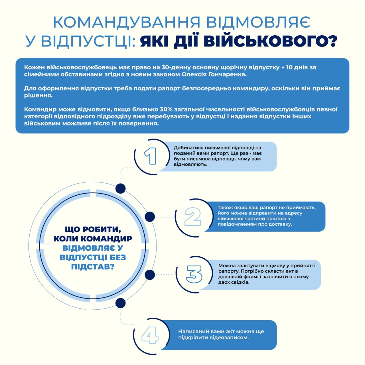 Нардеп, який є автором відповідної ініціативи, поділився спеціальною інструкцією, що робити військовому, коли командир не приймає його рапорту. Насамперед військовому потрібно домагатися письмового пояснення, чому саме йому відмовляють у його праві на відпустку. Також можна створити акт відмови та вказати в ньому двох свідків .
