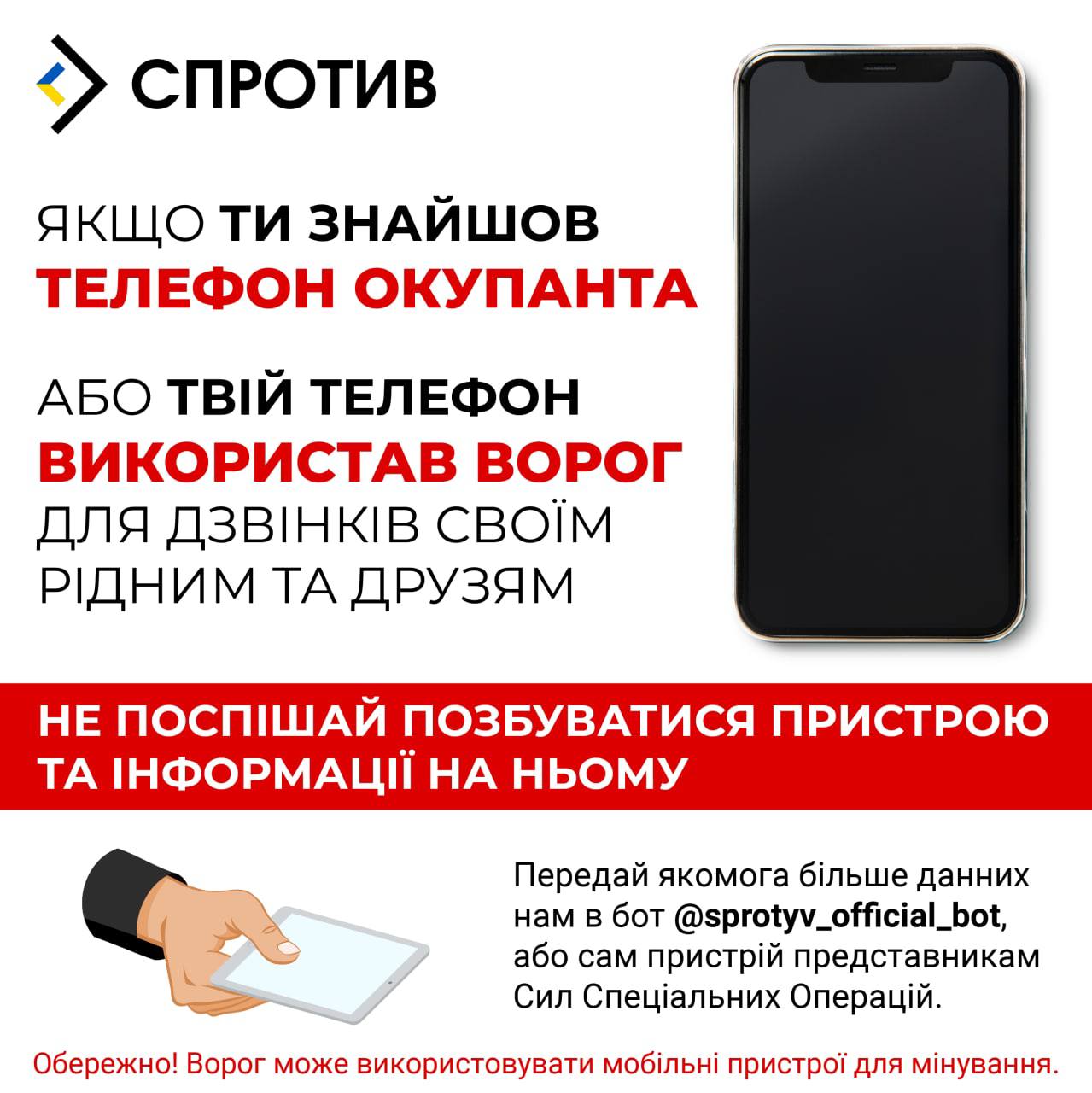 При виявленні телефону окупанта або якщо вашим телефоном скористався ворог для дзвінків своїм рідним та друзям необхідно одразу звернутись до Сил Спеціальних Операцій.
