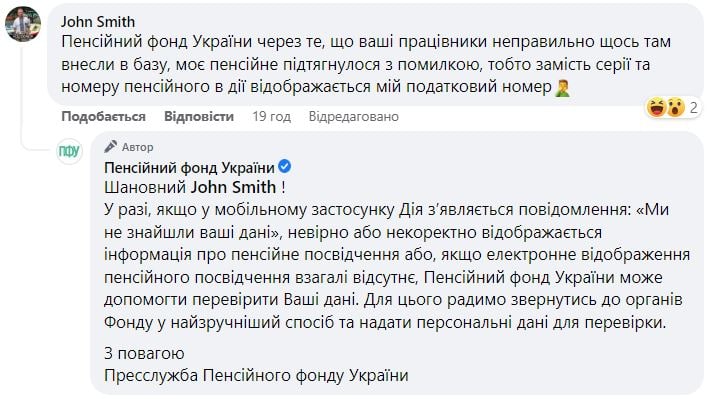 "Пенсійний фонд України, через те, що ваші працівники неправильно щось внесли в базу, моє пенсійне підтяглося з помилкою, тобто замість серії та пенсійного номера у " Дії" відображається мій податковий номер", - пише John Smith на сторінці фонду у Facebook.