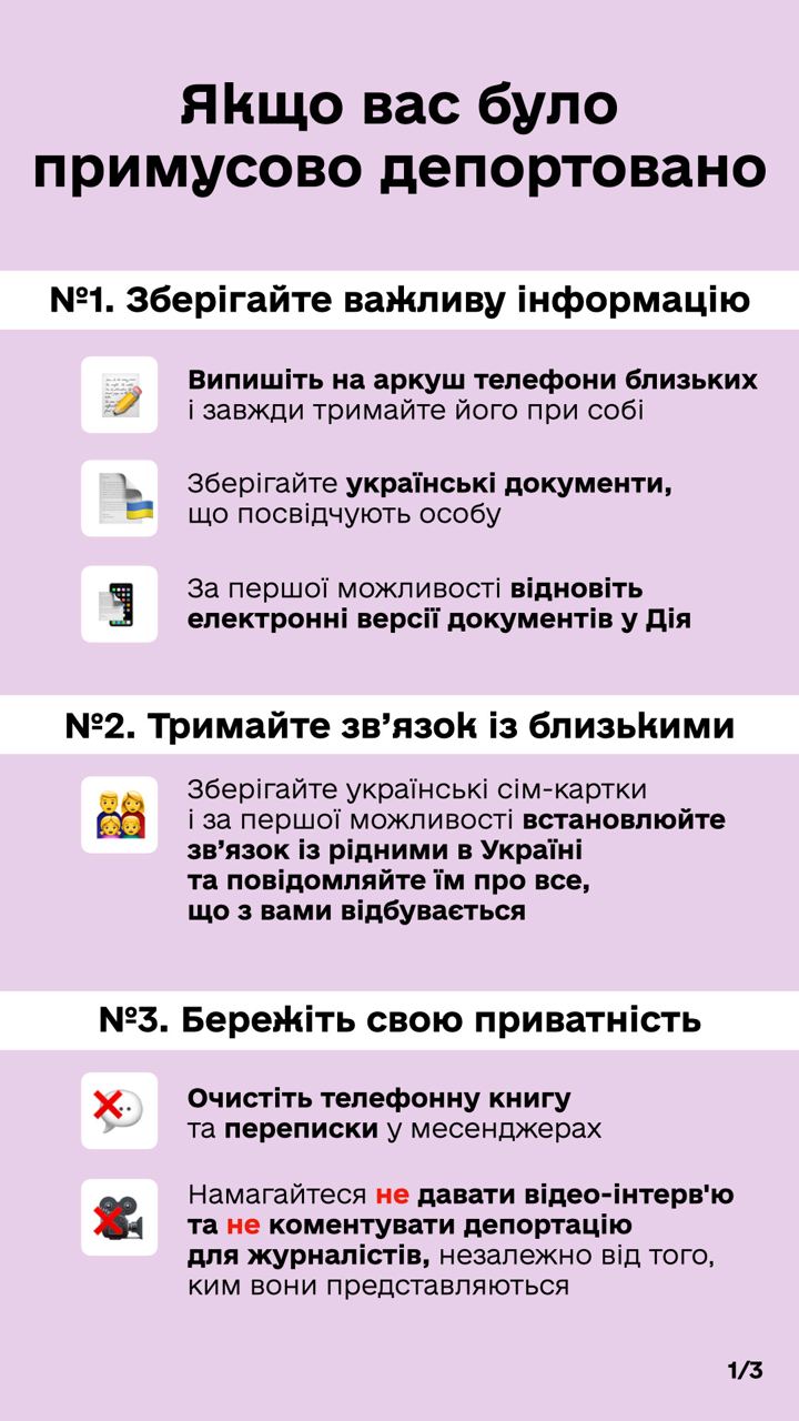 У разі примусової депортації на територію РФ українцям необхідно зберегти свої документи та сім-карти. Також слід виписати телефони рідних та близьких на аркуш паперу.