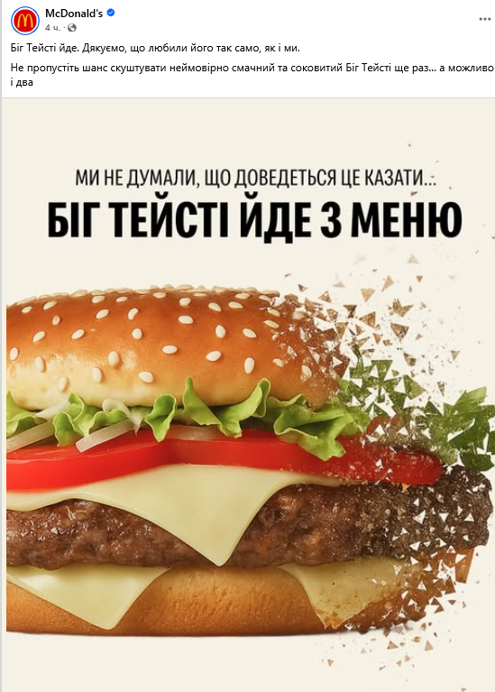 Представництво американської компанії закладів швидкого харчування "McDonald's" оголосило своїм шанувальникам, що бургер Біг Тейсті незабаром зникне з меню ресторанів.