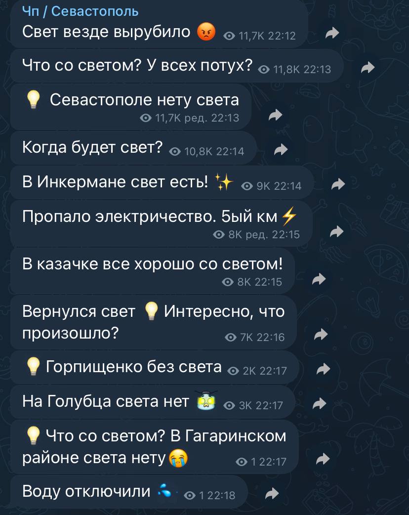 За попередньою інформацією, як заспокоїв жителів "губернатор" Михайло Развожаєв, з невідомих причин відключилася автоматика на підстанції "Севастополь" і для відновлення електропостачання споживачам фахівцям потрібно кілька годин.