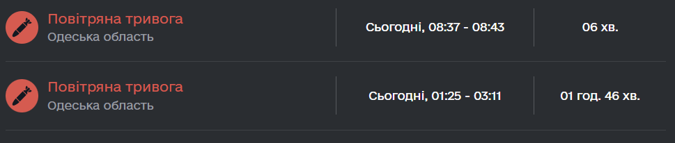 Сьогодні ж, 9 квітня, в Одесі повітряна тривога тривала з 01:25 до 03:11.