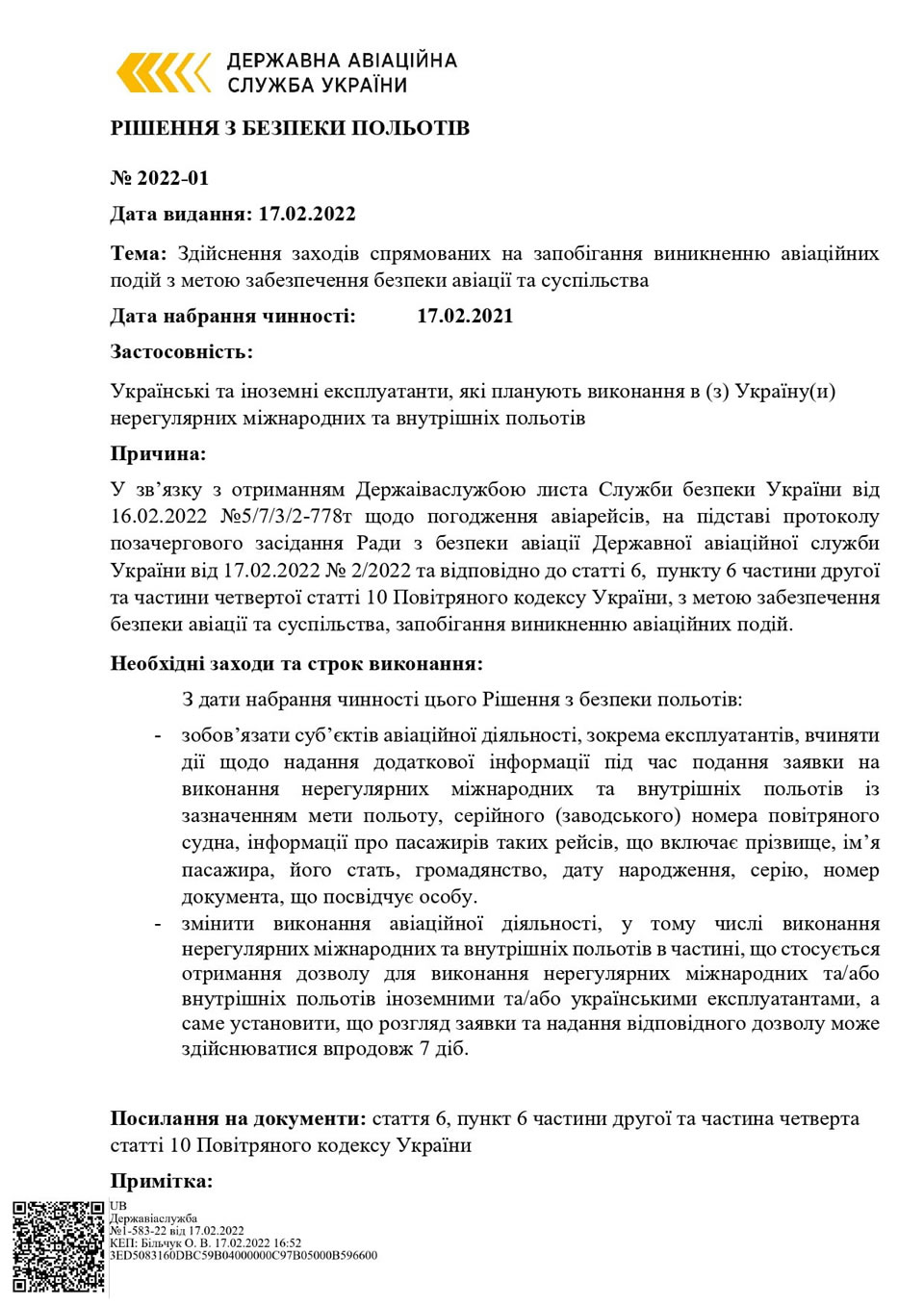 Державіаслужба ухвалила таке рішення задля здійснення заходів, спрямованих на запобігання виникненню авіаційних подій з метою забезпечення безпеки авіації і суспільства - на основі листа Служби безпеки.