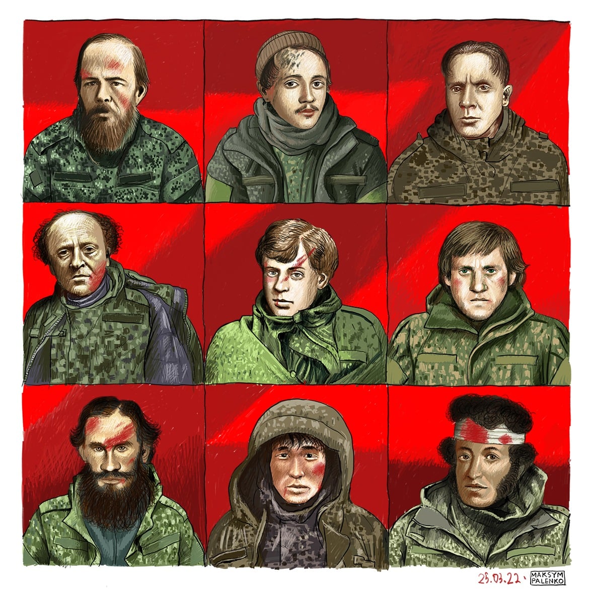 Український художник Максим Паленко намалював портрети російських класиків в образі військових РФ.