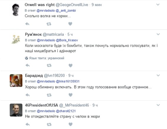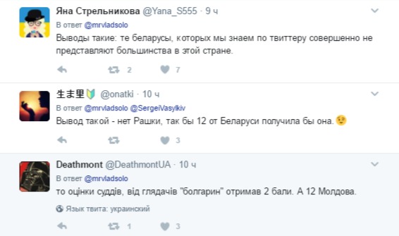 "Досить, нічого ображенку включати. В цьому році голосування взагалі дивне...", "Висновки такі: ті білоруси, яких ми знаємо з твіттеру абсолютно не становлять більшості в цій країні", "Не ототожнюйте країну з челом у журі", "То оцінки суддів, від глядачів "болгарин" отримав 2 бали. А 12 Молдова", "Висновок такий - немає Рашки, так би 12 від Білорусі отримала б вона", - відзначають вони.