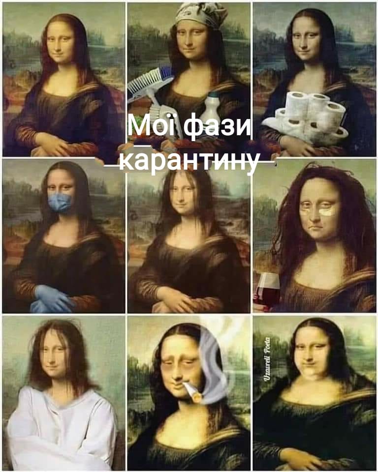 Не обійшлося і без традиційної картини Мона Ліза, зображення котрої змінюється в залежності від фази карантину, а також милої собачки, яка сильно засмутилася через очікування і реальності наслідків від запровадженого карантину.