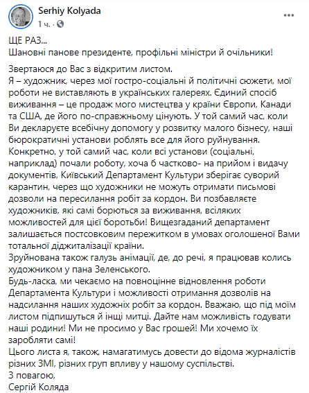 Український художник Сергій Коляда написав відкритого листа зі зверненням до української влади скасувати суворий карантин в Київському департаменті культури, через що художники не можуть отримати письмові дозволи на пересилку робіт за кордон.
