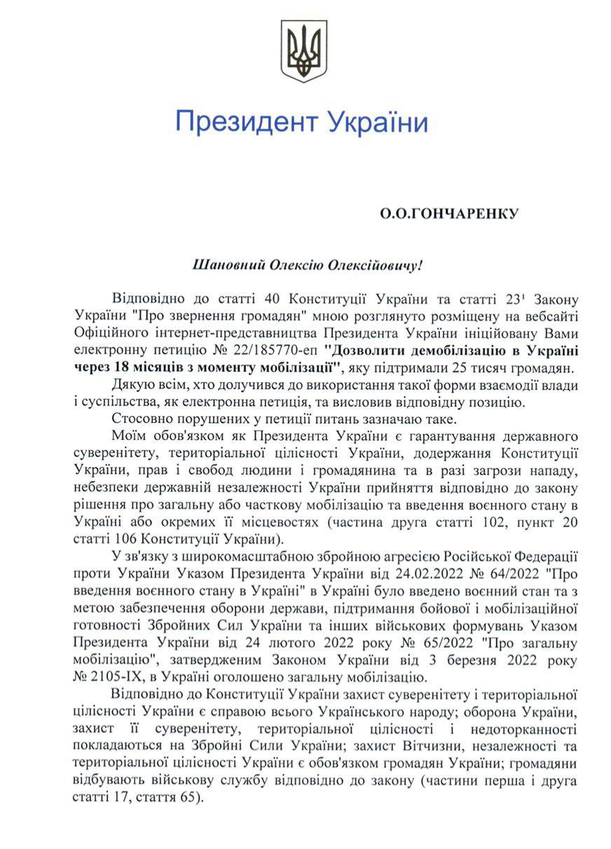Як повідомив нардеп від "Євросолідарності" Олексій Гончаренко, який оприлюднив текст петиції, українці отримали відповідь про питання демобілізації через два роки, адже петиція у 2023 році набрала необхідні для розгляду 25 тис. голосів.