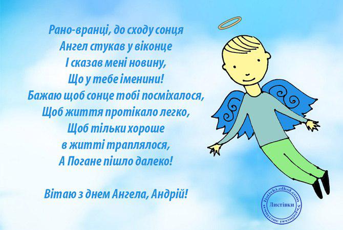 Дорогий Андрію, вітаю тебе з Днем ангела! Нехай мужність твого імені завжди буде надійною опорою і захистом в житті. Нехай у твоїй долі завжди буде присутнє щастя, любов, вірність, гідність, удача. Бажаю, щоби з тобою завжди було спокійно і надійно, і щоб за тобою хотілося йти хоч на край світу.