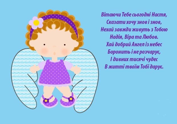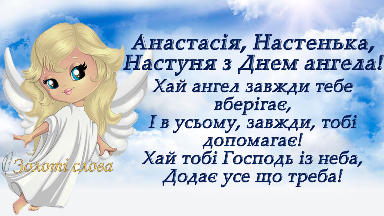 Анастасія, твоє ім'я звучить гордо, по-царськи! Бажаю, щоб ти завжди відчувала себе королевою, і життя твоє було схоже на прекрасну казку. Нехай кожен день трапляються справжні чудеса, настрій буде сонячним, а близькі завжди будуть поруч, готові в будь-яку хвилину підтримати та обійняти!