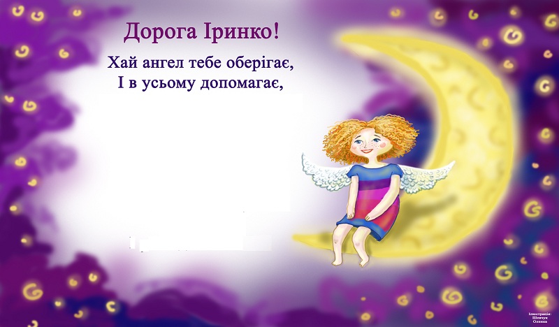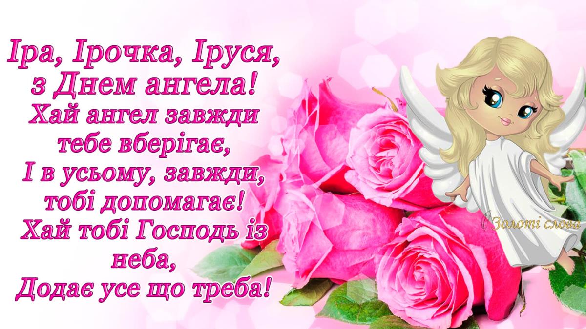 З Днем ангела тебе! Нехай добрий художник розфарбує твоє життя яскравими фарбами, а талановитий композитор напише мажорну мелодію твоєї долі. У сплячої красуні були феї, а твоєю феєю нехай буде твоя свята заступниця Іра. Бажаю тобі міцного здоров'я і сил, везіння, успіхів та удачі у всіх починаннях, здійснення заповітних бажань, вірних друзів і сімейного щастя!
