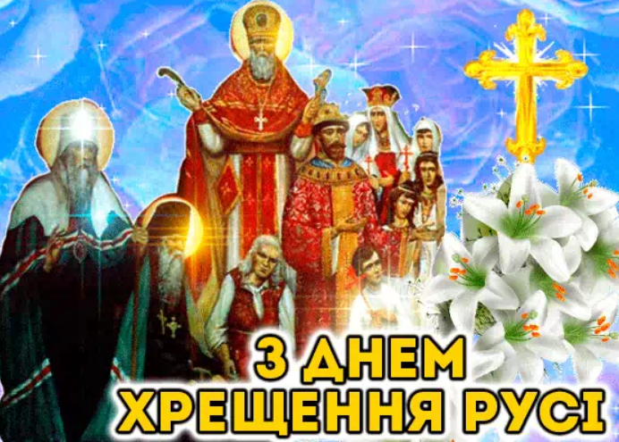 З Днем хрещення Русі! У це світле свято щиро зичу вам міцного здоров'я, миру, любові, сімейного тепла, Божого благословення та успіхів в усіх добрих починаннях.
