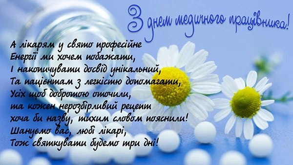 Вітаю з Днем медичного працівника! Бажаю ясного і сонячного настрою, адже часом буває нелегко і похмуро навколо. Нехай посмішкою починається кожен день! Доброго тобі оточення, чарівних результатів в кар"єрі і величезною зарплати!