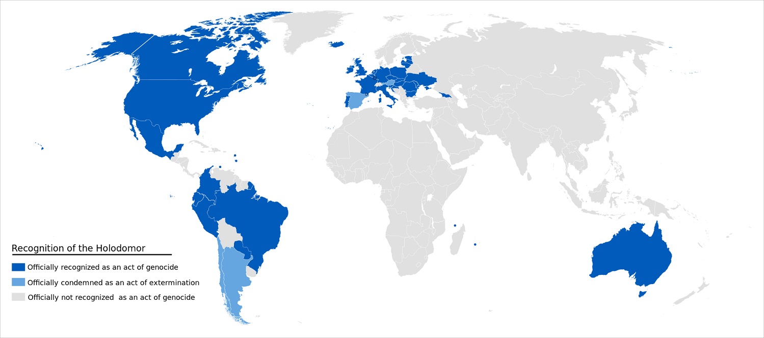 picture Темно-синім кольором позначені країни, які офіційно визнали Голодомор актом геноциду. Світло-синім - країни, які офіційно засудили Голодомор, як акт винищення людства. Сірим - країни, які не визнали Голодомор актом геноциду та не засудили його.