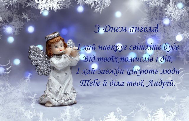 У День Андрія хочу побажати, щоб твій ангел завжди тебе оберігав і допомагав тобі в усіх твоїх справах - сімейних і робочих, щоб всі твої починання були втілені в життя, щоб тебе завжди супроводжували удача, процвітання і успіх.
