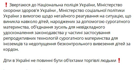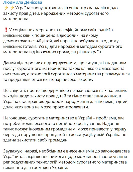 "Це свідчить про те, що державою не застосовуються всі необхідні заходи для захисту прав дітей та гідного ставлення до них, а Україна стає країною-донором народження для іноземців дітей, долю яких вона не може проконтролювати", - додала омбудсмен.