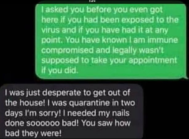 "Мені не слід було приходити на прийом, але мені відчайдушно потрібно було зробити нігті! Два дні тому отримала позитивний результат на вірус, так що, будь ласка, відправляйтеся на карантин", - написала заражена COVID-19 клієнтка.