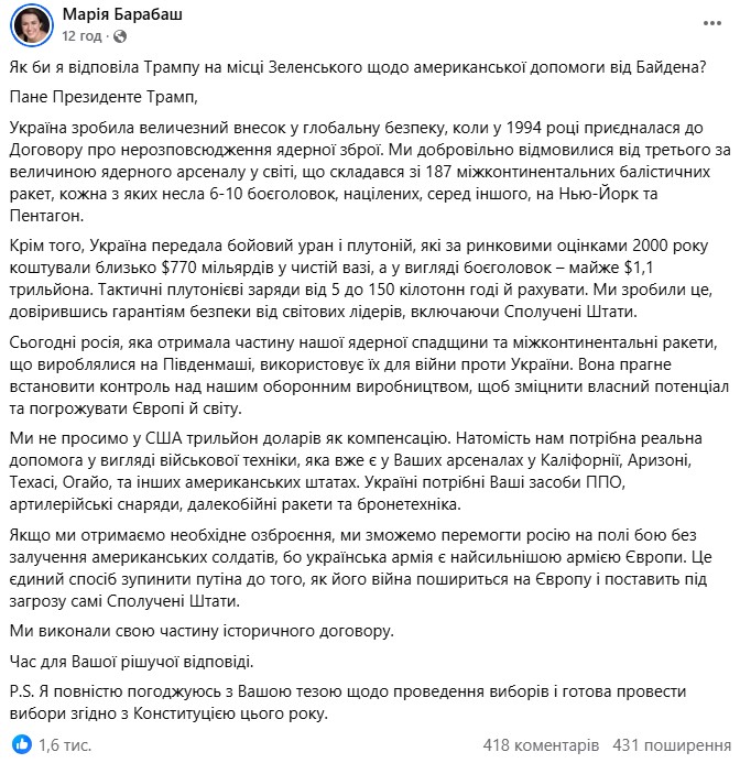 Також Барабаш написала текст відповіді, яку дала б Трампу на місці Зеленського.