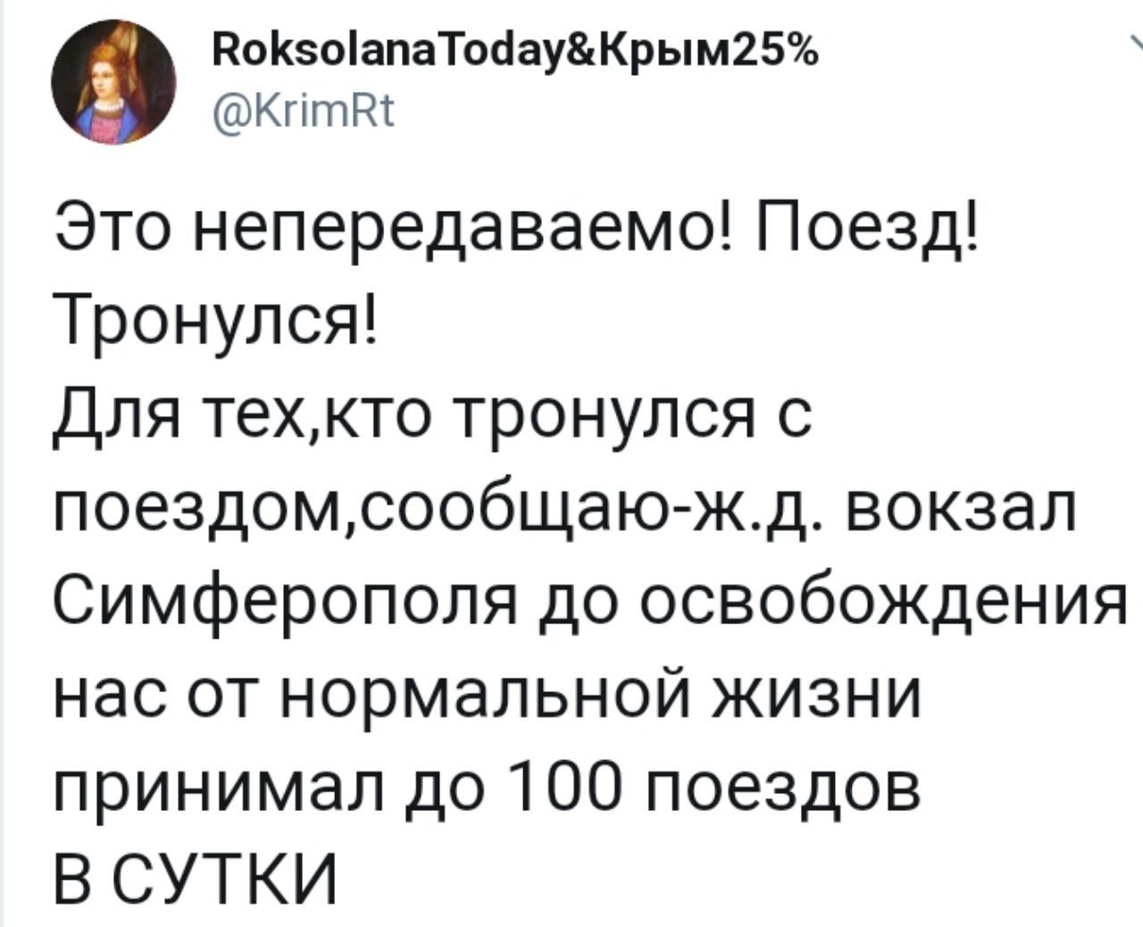 "Це не передати словами! Потяг! Поїхав! Для тих, хто поїхав разом із потягом. повідомляю, що залізничний вокзал Сімферополя до звільнення нас від нормального життя приймав до 100 потягів за добу", - написали в блозі.