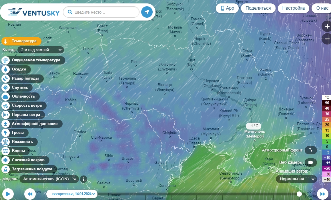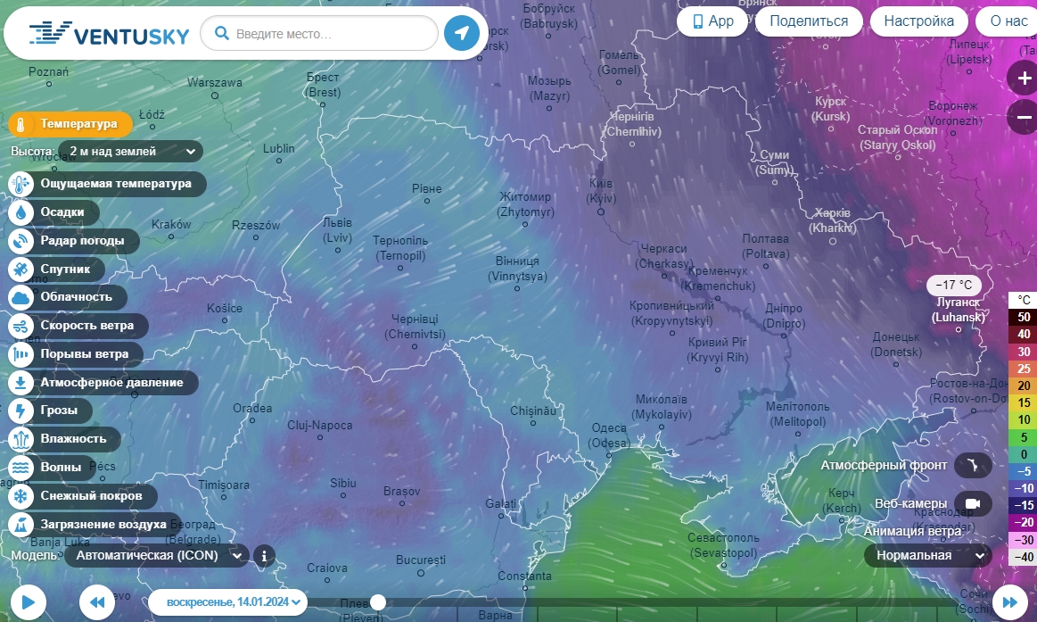 У неділю, 14 січня, температура повітря вночі -8...-13 °С, на сході -15...-21 °С; вдень -3...-8 °С. У західних, центральних та північних областях очікується сніг, місцями хуртовина. На дорогах ожеледиця.