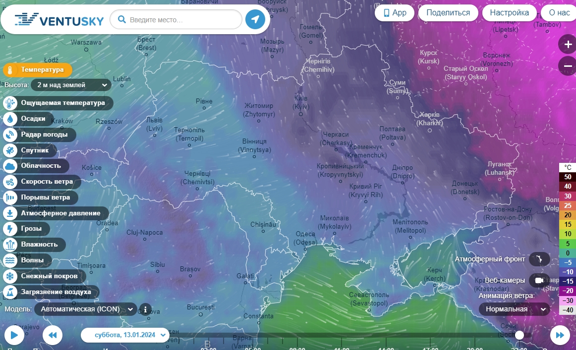 У суботу, 13 січня, температура повітря вночі -16...-21°С, у західних, центральних та північних областях місцями до -22...-27°С. Вдень -10...-15 °С, у західних та південних областях -3...-8°С. В Криму, Приазов'ї та на сході, а також у північних областях і на Поліссі очікується невеликий сніг. На дорогах ожеледиця.