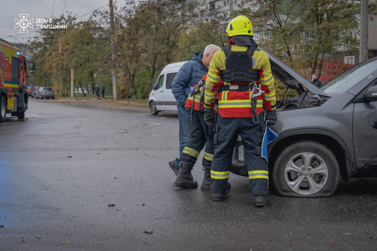 "Вдень 21 жовтня ворог наніс удар по м. Суми. Влучання сталося по проїзній частині, пошкоджено цивільні автомобілі, об"єкт цивільної інфраструктури, а також вибуховою хвилею вибило вікна в трьох багатоквартирних житлових будинках. За попередньою інформацією, травмовано 12 людей", – йдеться у повідомленні.