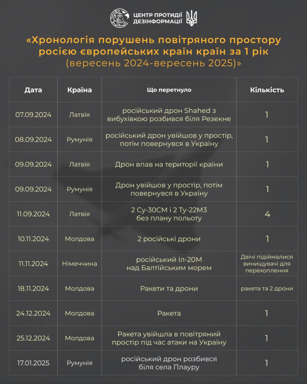Згідно з дослідженням, за період із вересня 2024 року по вересень 2025-го загалом було зафіксовано 36 порушень повітряного простору європейських країн.