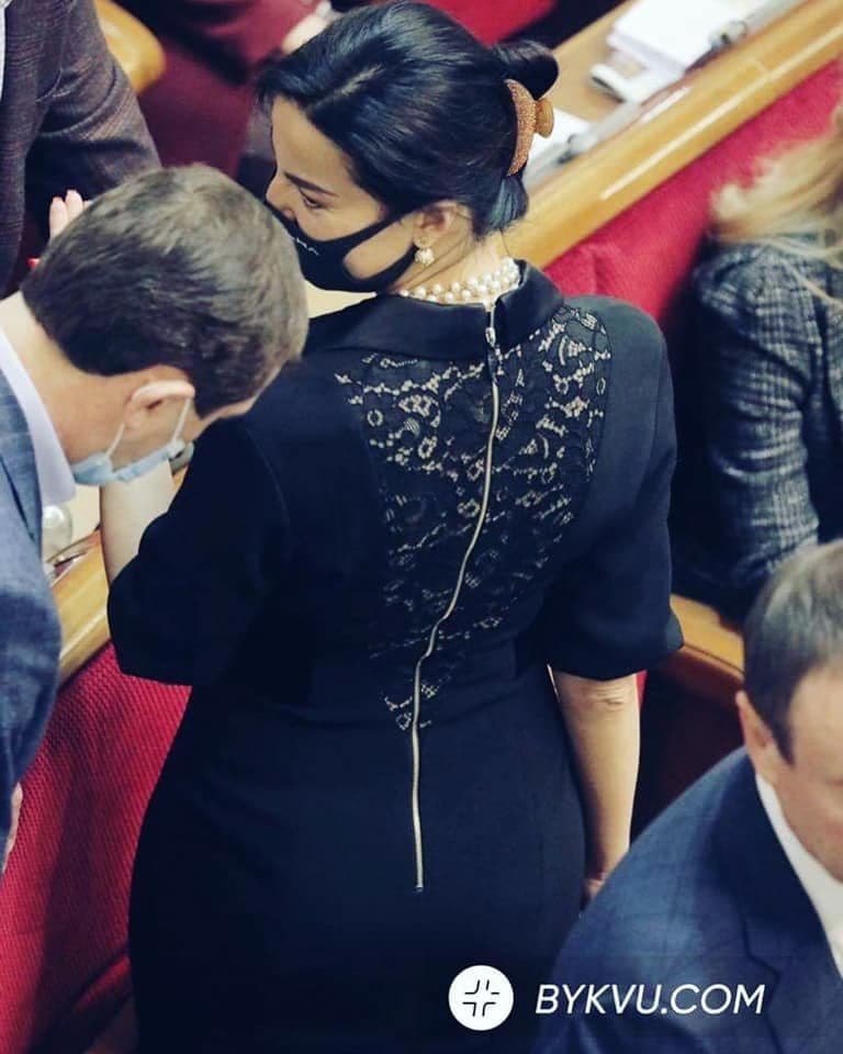 На опублікованому "пікантному" кадрі видно, як Дмитрієва стоїть спиною, а один з колег відверто задивився на неї ззаду. Може бути, він і не дивився на "слугу народу", але на фотографії це виглядає саме так.