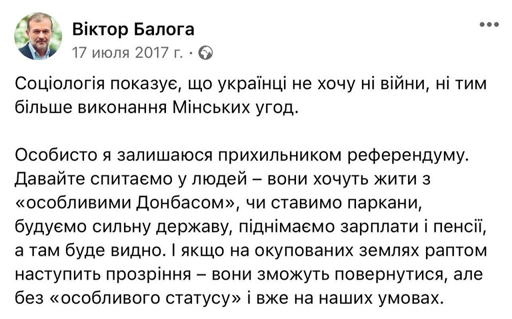 "Підняв його старі повідомлення. А там – тупо все. Немає тільки фотографії паспорта громадянина Росії. Тут вам і пропозиція від Балоги провести референдум на Донбасі, і "дати окупованим територіям пожити 15 років" та багато іншого. Наскільки мені відомо, публічні заклики від'єднати території України підпадають під держзраду, не говорячи вже про позбавлення мандату", - пише Голобуцький.