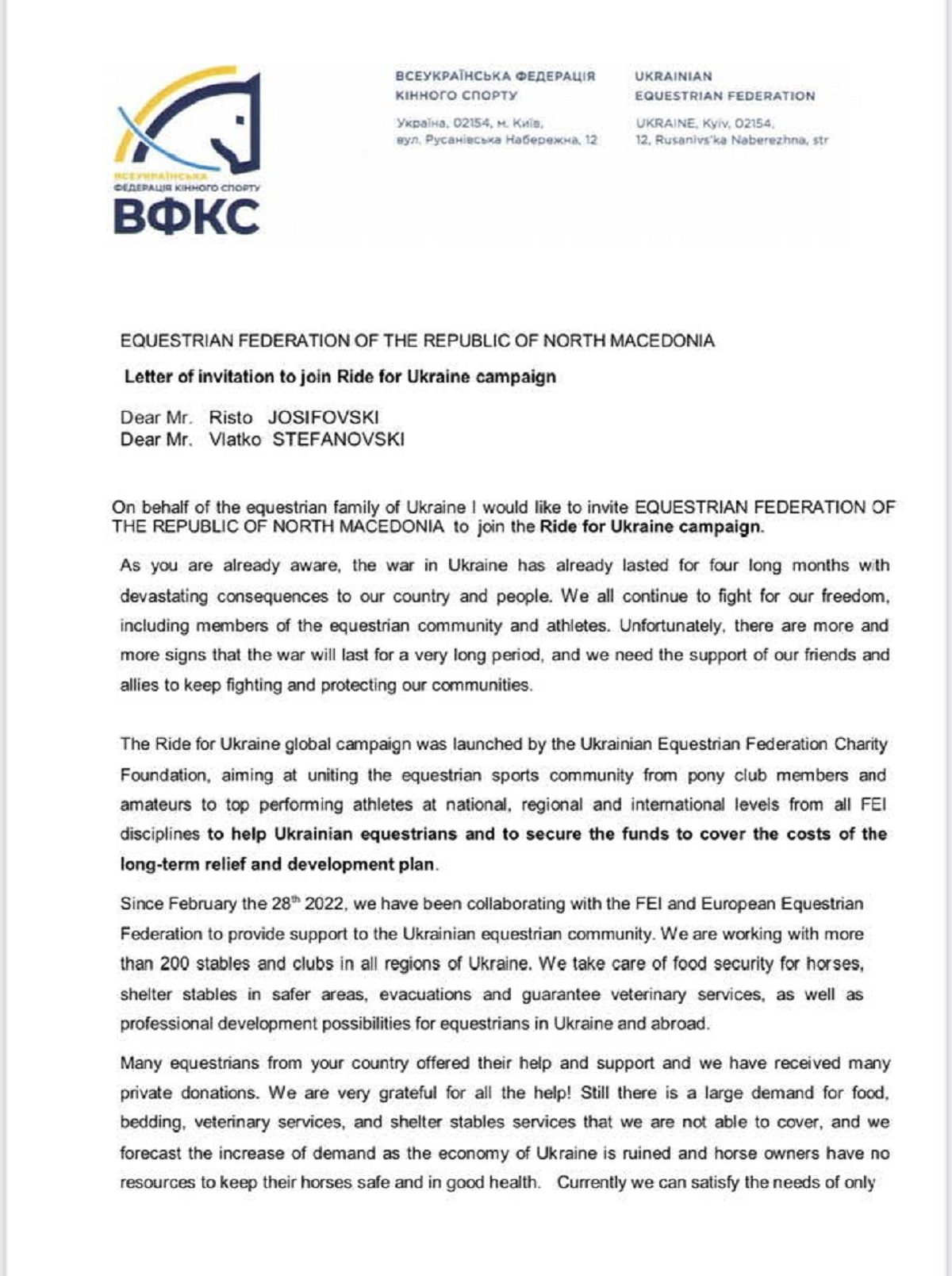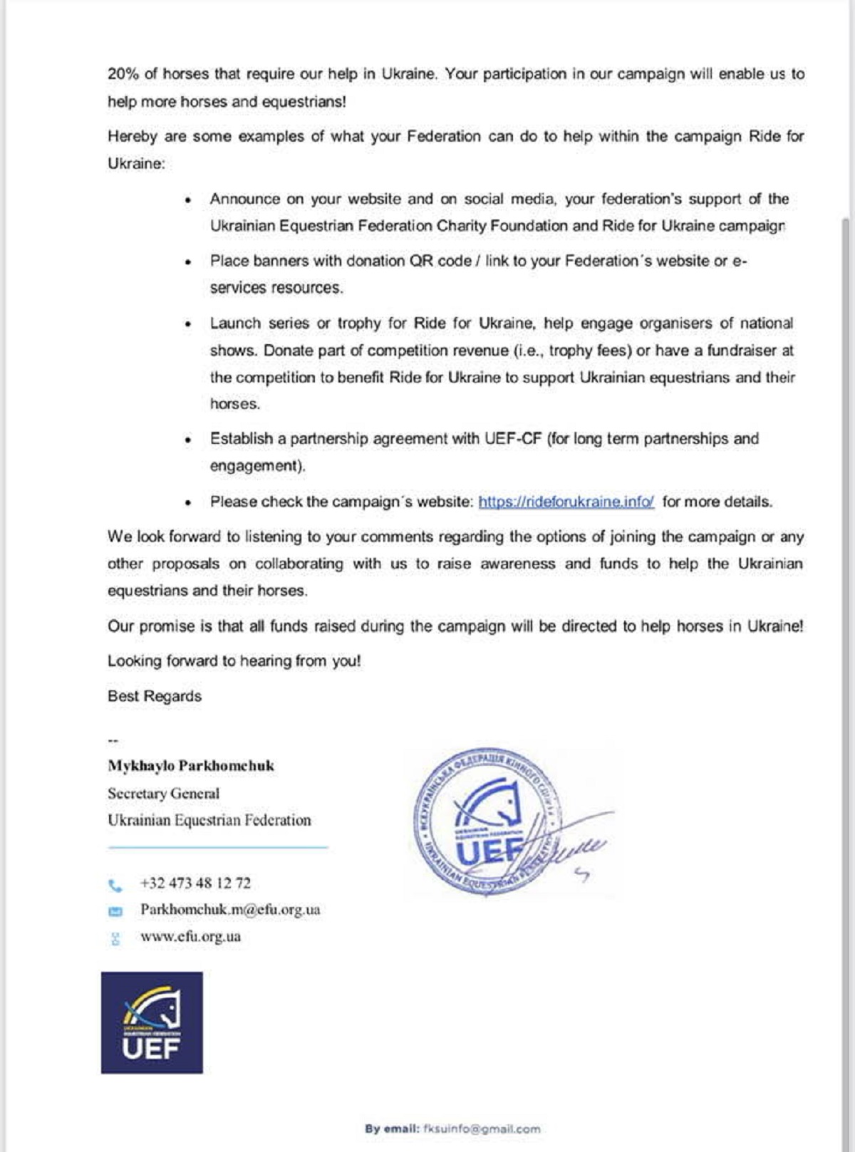 "У перші дні повномасштабного російського вторгнення в Україну велика кількість кіннотників зі всього світу активно відгукнулася допомогти українським кінотникам та надала допомогу. Переважно це були фінансові ресурси, які перераховували на новостворений бельгійський фонд Ukrainian Equestrian Charity Foundation. Зокрема керівництво Міжнародної федерації кінного спорту (FEI) запропонувала допомогу в 1 000 000 CHF (швейцарських франків). Кошти було перераховано на новостворений бельгійський благодійний фонд Ukrainian Equestrian Charity Foundation. Це не єдине джерело допомоги, адже багато кінотників всього світу відгукнулися допомогти українським колегам, в приватному порядку перераховували суми в 30 000- 40 000 євро", - йдеться в публікації.