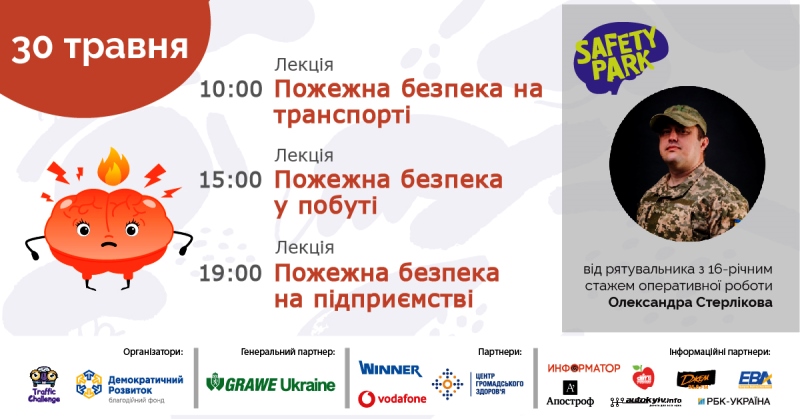 30 травня вперше в Україні відбудеться загальнонаціональний марафон з пожежної безпеки, який організовує міжнародний освітній центр Safety Park. В рамках марафону буде проведено три безкоштовні онлайн-лекції з пожежної безпеки.