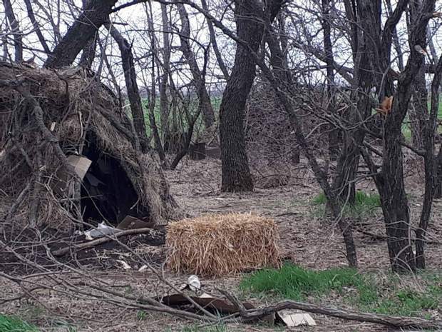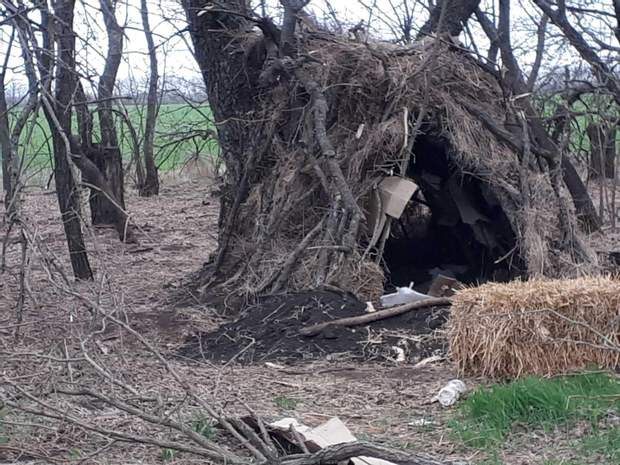 Він показав фото імпровізованої хати з гілок, сухої трави, розритої землі.