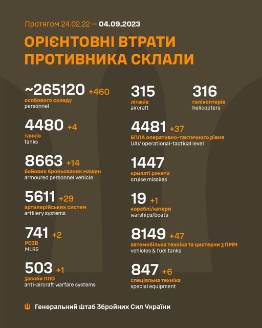 Так, повідомляється, що загальні бойові втрати противника з 24.02.22 по 04.09.23 орієнтовно склали: