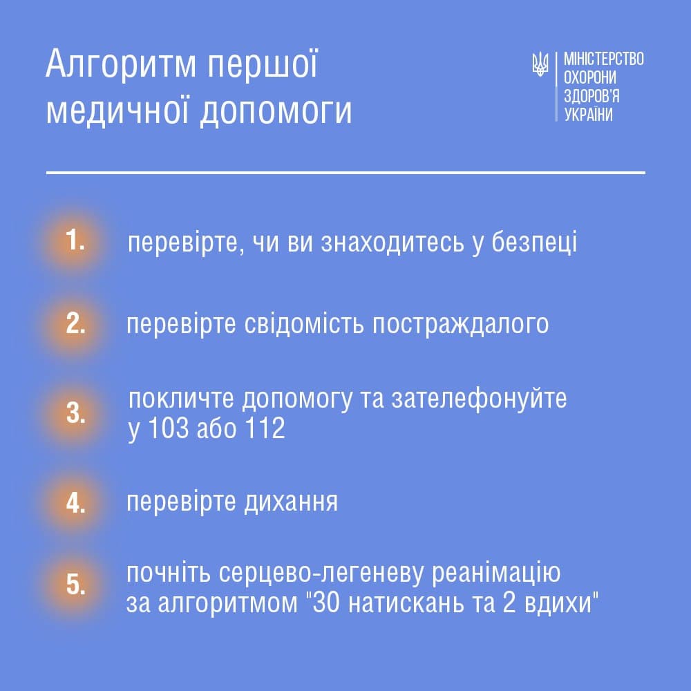 У МОЗ наголосили, що в разі, якщо людина вам не знайома, не варто проводити штучне дихання, адже існує ризик заразитися вірусною інфекцією. Якщо ви знаєте людину і у вас є плівка-клапан, після 30 натискань необхідно зробити два глибокі вдихи, закривши потерпілому ніс.