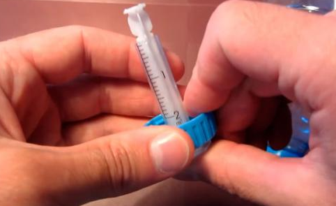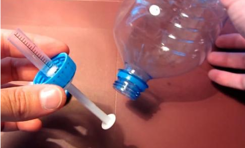Зі шприца й кришки потрібно виготовити клапан для рукомийника, проробивши ножем рівномірний круглий отвір у кришці. Шприц має заходити в отвір туго. Далі треба вставити шприц в отвір кришки та зрізати з нього край, щоб вийшла трубка та поршень міг виходити з трубки.
