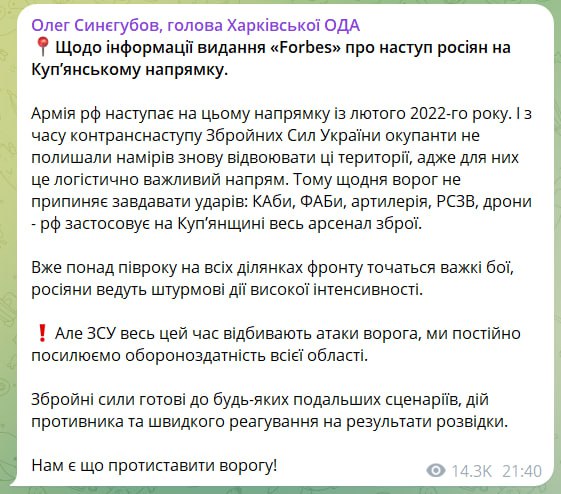 За словами Синєгубова, армія РФ намагається захопити Харківщину ще з лютого 2022. ЗСУ вже стримали не один ворожий наступ на цьому напрямку, але ворог не зміг за два роки досягти жодної зі своїх цілей.