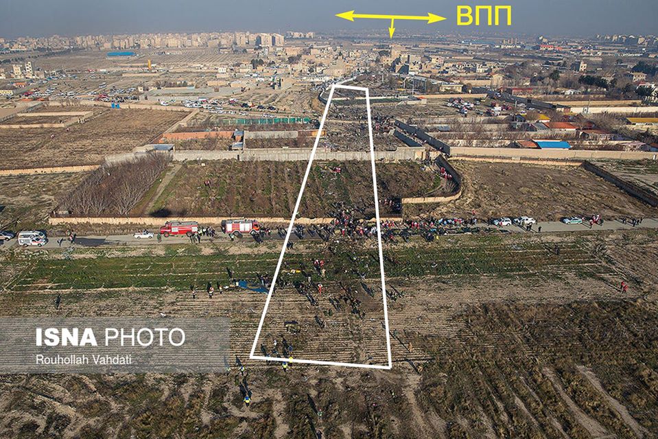 Аналіз фотознімку з висоти пташиного польоту області випадання уламків українського літака, який розбився в ніч на 8 січня під Тегераном (Іран), вказує на його некероване падіння під значним кутом.