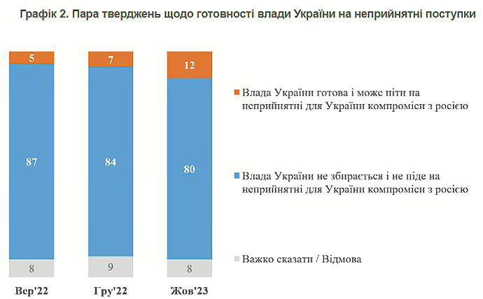 Зазначається, що абсолютна більшість українців (80%) – переконані в тому, що влада не піде на компроміси (не у вересні минулого року їхня кількість становила 87 %).
