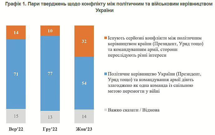 Повідомляється, що протягом останнього року з 14% до 32% збільшилася кількість українців, які вірять у наявність серйозних конфліктів між політичним керівництвом країни та військовим армією.