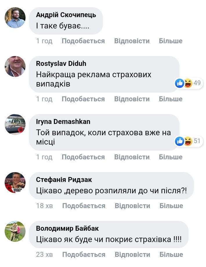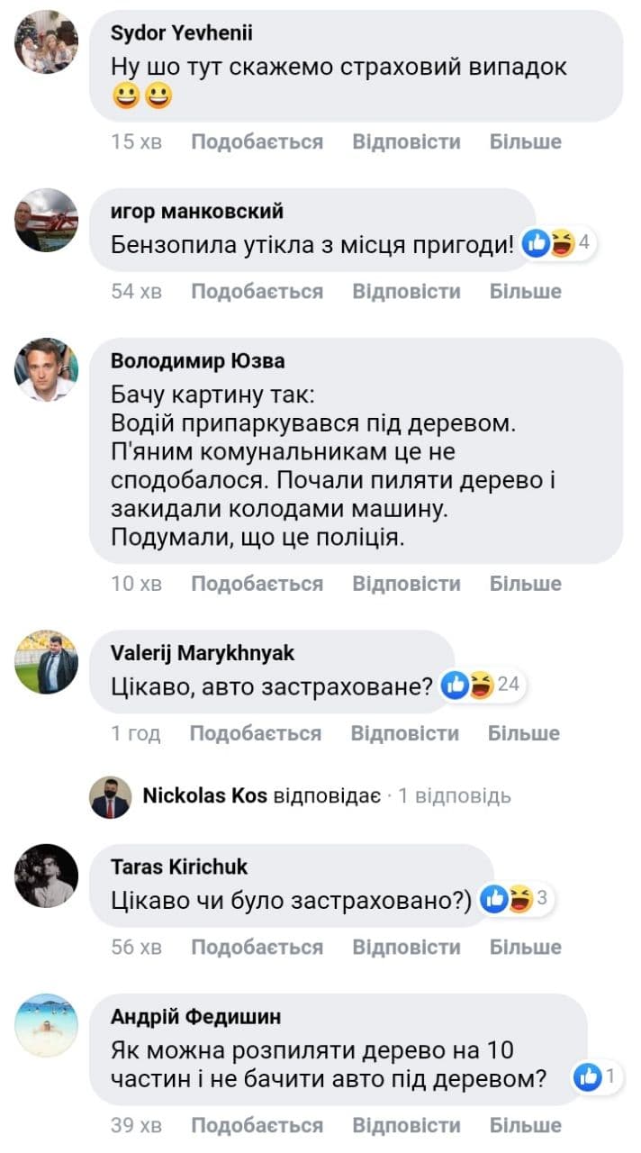 Як видно на фото, машина страхової компанії стояла біля місця, де проводилися роботи зі зрізання дерев. Однак обставини, за яких частина зрізаного дерева впала просто на автомобіль, невідомі.