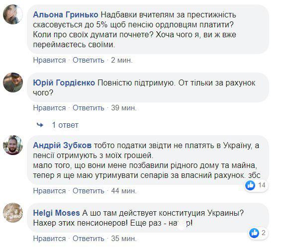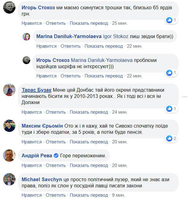 "Нехай Сивохо спочатку поїде туди і збере податки за останні п'ять років, тоді буде і пенсія", "Спершу нехай повернуть загиблих, тоді і поговоримо", - коментують в мережі.