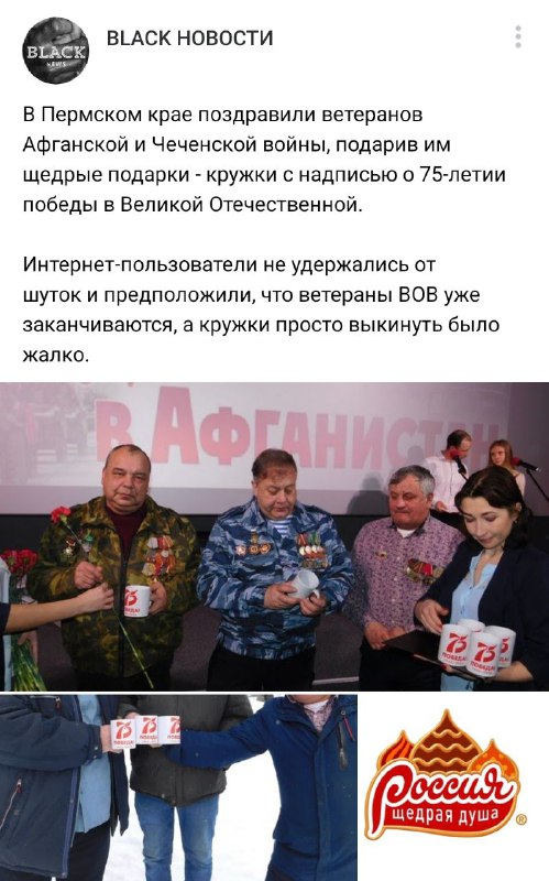 У Пермському краї привітали ветеранів війни, подарувавши їм "щедрі" подарунки - кружки з написом про 75-річчя перемоги у Великій Вітчизняній.