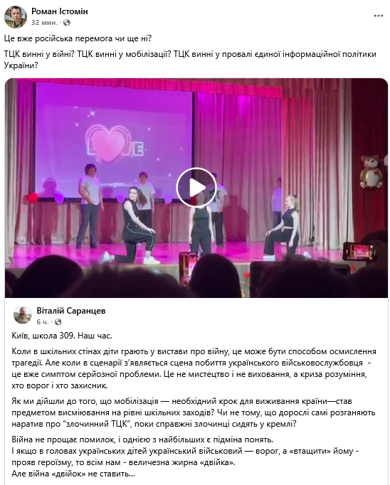 Йдеться про київську середню загальноосвітну школу № 309, де під час вистави на воєнну тематику була показана сцена побиття військовослужбовця ТЦК.