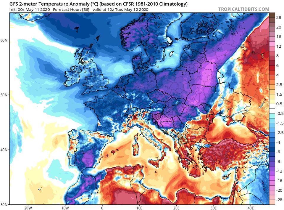 "Похолодання в Європі 11-12 травня. У зв'язку з проходженням холодного фронту з хвилями 11-12 травня через деякі країни Європи ... очікується інтенсивне похолодання в супроводі місцями снігопадів та навіть хуртовин", - зазначив він.