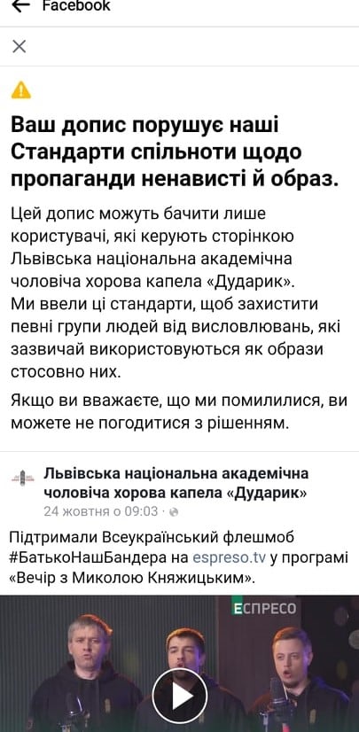 У соціальній мережі Facebook з незрозумілих причин заблокували відео з патріотичною піснею "Батько наш Бандера" у виконанні Львівської академічної чоловічої хорової капели "Дударик". Ця пісня вибухнула в інтернеті. Тільки в той час, як в Україні школярі влаштовують флешмоби з цією піснею, росіяни звинувачують пісню у "пропаганді ненависті та образ".